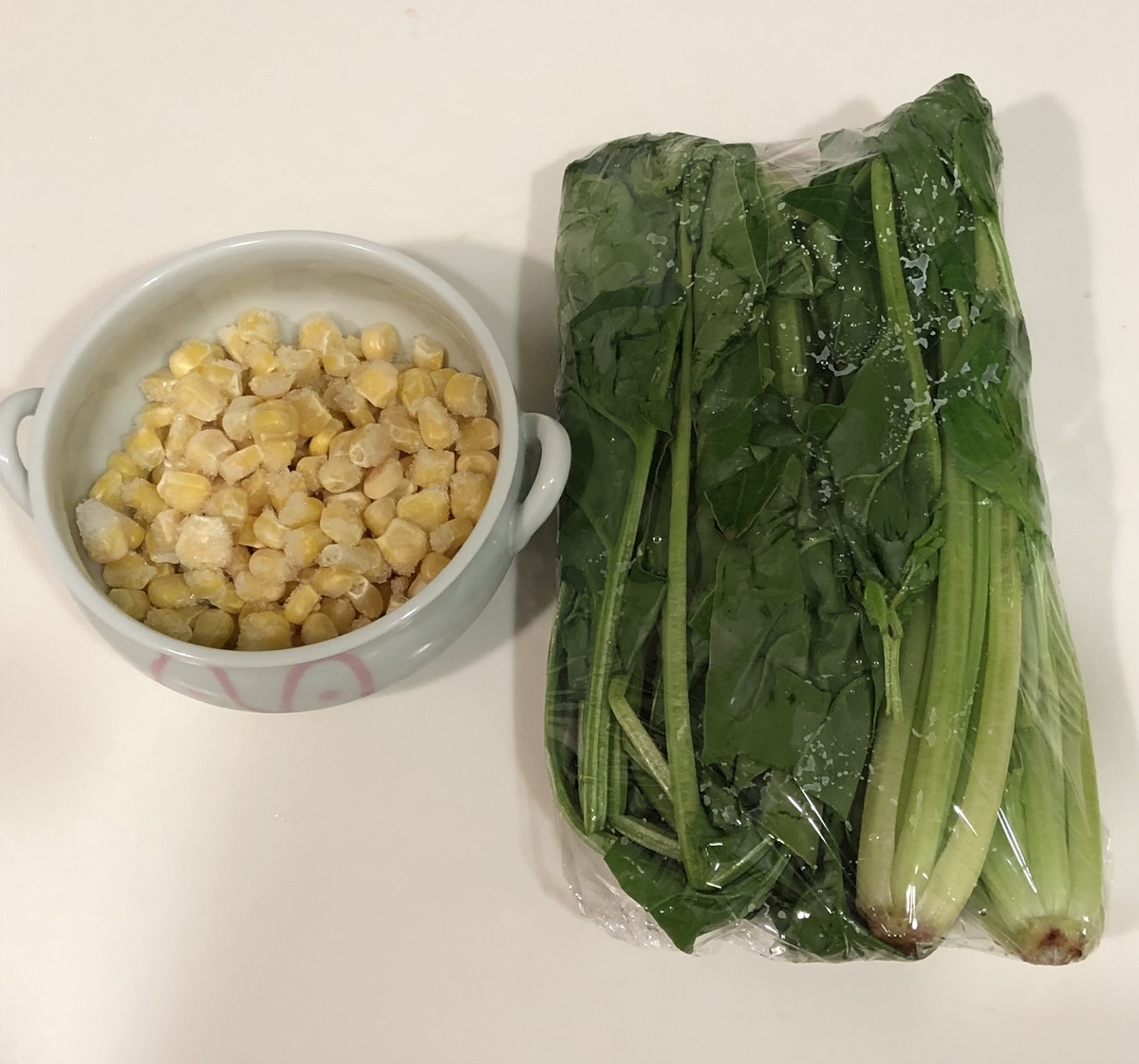 3.時短のため、コーンとほうれん草は一緒に電子レンジで加熱しちゃいます。