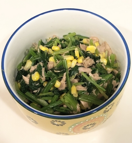 ほうれん草に、水気を切ったコーンと油を切ったツナを加えます。